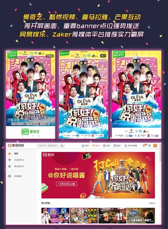 《你好!说唱酱》于12月23日在爱奇艺、酷燃视频率先上线,紧接着又在腾讯视频、优酷视频陆续出击,除此之外今日头条、秒拍、美拍、A站、B站等全网几十家视频平台集结,联手推广节目相关视频、病毒物料,截止至25日晚11点,全网总播放量已突破1000万。