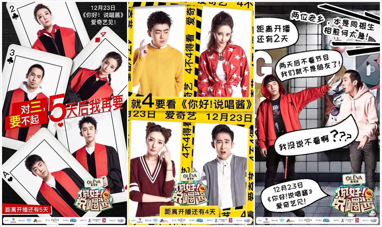 《你好!说唱酱》开播前连续发布倒计时海报及其他病毒物料,调动行业、媒体朋友圈连续五天疯狂转发,形成朋友圈近千次刷屏,为节目开播积累声势与口碑。